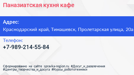 Паназиатская кухня, кафе по адресу Краснодарский край, Тимашевск, Пролетарская улица, 20а в дальнейшем Организация, размещена в следующих категориях: