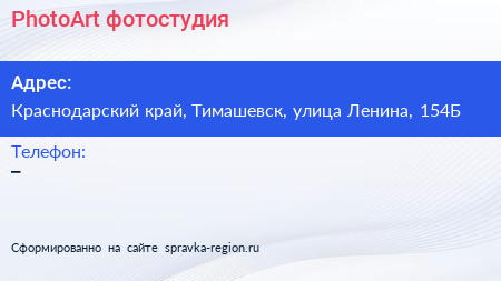 PhotoArt, фотостудия по адресу Краснодарский край, Тимашевск, улица Ленина, 154Б в дальнейшем Организация, размещена в следующих категориях: