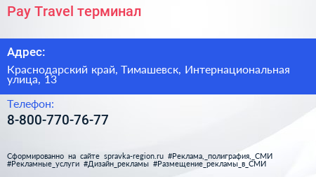 Pay. Travel, терминал по адресу Краснодарский край, Тимашевск, Интернациональная улица, 13 в дальнейшем Организация, размещена в следующих категориях: