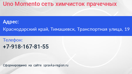 Uno Momento, сеть химчисток-прачечных по адресу Краснодарский край, Тимашевск, Транспортная улица, 19 в дальнейшем Организация, размещена в следующих категориях:
