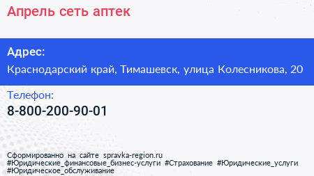 Апрель, сеть аптек по адресу Краснодарский край, Тимашевск, улица Колесникова, 20 в дальнейшем Организация, размещена в следующих категориях: