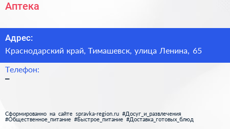 Аптека по адресу Краснодарский край, Тимашевск, улица Ленина, 65 в дальнейшем Организация, размещена в следующих категориях: