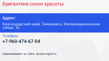 Бригантина, салон красоты по адресу Краснодарский край, Тимашевск, Интернациональная улица, 1а в дальнейшем Организация, размещена в следующих категориях: