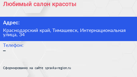 Любимый, салон красоты по адресу Краснодарский край, Тимашевск, Интернациональная улица, 34 в дальнейшем Организация, размещена в следующих категориях: