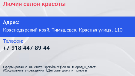 Лючия, салон красоты по адресу Краснодарский край, Тимашевск, Красная улица, 110 в дальнейшем Организация, размещена в следующих категориях: