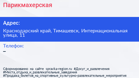 Парикмахерская по адресу Краснодарский край, Тимашевск, Интернациональная улица, 11 в дальнейшем Организация, размещена в следующих категориях: