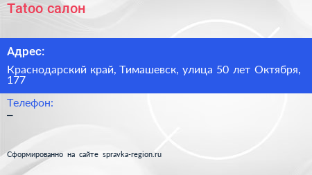 Tatoo салон по адресу Краснодарский край, Тимашевск, улица 50 лет Октября, 177 в дальнейшем Организация, размещена в следующих категориях: