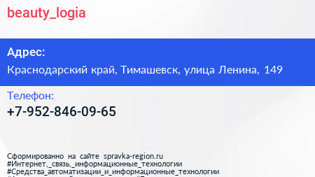 beauty_logia по адресу Краснодарский край, Тимашевск, улица Ленина, 149 в дальнейшем Организация, размещена в следующих категориях: