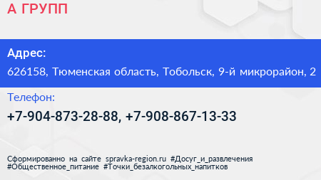 А-ГРУПП по адресу 626158, Тюменская область, Тобольск, 9-й микрорайон, 2 в дальнейшем Организация, размещена в следующих категориях:
