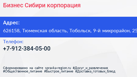 Бизнес Сибири, корпорация по адресу 626158, Тюменская область, Тобольск, 9-й микрорайон, 25 в дальнейшем Организация, размещена в следующих категориях: