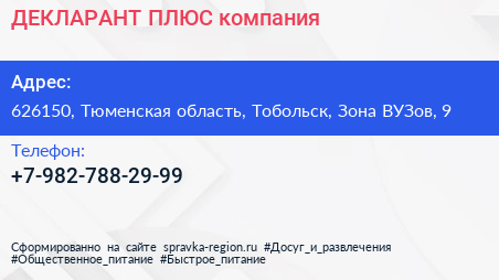 ДЕКЛАРАНТ ПЛЮС, компания по адресу 626150, Тюменская область, Тобольск, Зона ВУЗов, 9 в дальнейшем Организация, размещена в следующих категориях:
