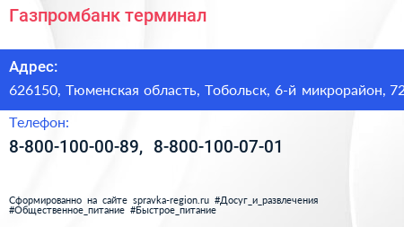 Газпромбанк, терминал по адресу 626150, Тюменская область, Тобольск, 6-й микрорайон, 72 в дальнейшем Организация, размещена в следующих категориях: