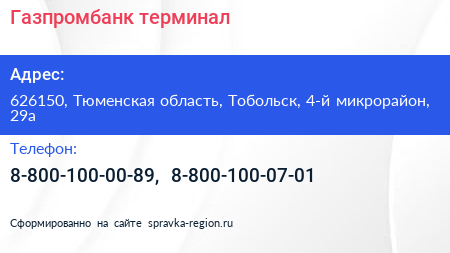 Газпромбанк, терминал по адресу 626150, Тюменская область, Тобольск, 4-й микрорайон, 29а в дальнейшем Организация, размещена в следующих категориях:
