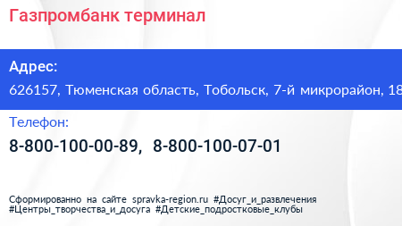Газпромбанк, терминал по адресу 626157, Тюменская область, Тобольск, 7-й микрорайон, 18 в дальнейшем Организация, размещена в следующих категориях:
