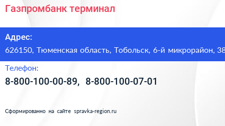 Газпромбанк, терминал по адресу 626150, Тюменская область, Тобольск, 6-й микрорайон, 38 в дальнейшем Организация, размещена в следующих категориях: