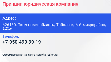 Принцип, юридическая компания по адресу 626150, Тюменская область, Тобольск, 6-й микрорайон, 120ж в дальнейшем Организация, размещена в следующих категориях: