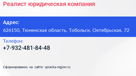 Реалист, юридическая компания по адресу 626150, Тюменская область, Тобольск, Октябрьская, 72 в дальнейшем Организация, размещена в следующих категориях: