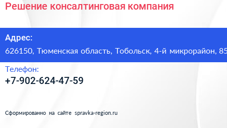 Решение, консалтинговая компания по адресу 626150, Тюменская область, Тобольск, 4-й микрорайон, 85 в дальнейшем Организация, размещена в следующих категориях: