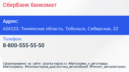 СберБанк, банкомат по адресу 626123, Тюменская область, Тобольск, Сибирская, 22 в дальнейшем Организация, размещена в следующих категориях: