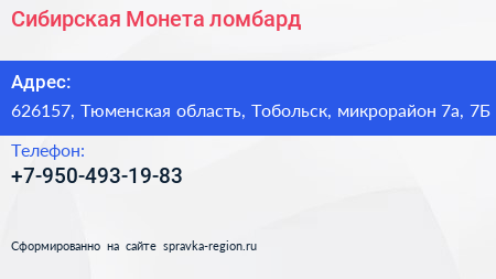 Сибирская Монета, ломбард по адресу 626157, Тюменская область, Тобольск, микрорайон 7а, 7Б в дальнейшем Организация, размещена в следующих категориях: