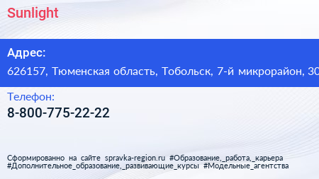Sunlight по адресу 626157, Тюменская область, Тобольск, 7-й микрорайон, 30 в дальнейшем Организация, размещена в следующих категориях: