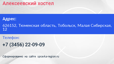Алексеевский, хостел по адресу 626152, Тюменская область, Тобольск, Малая Сибирская, 12 в дальнейшем Организация, размещена в следующих категориях: