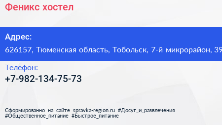 Феникс, хостел по адресу 626157, Тюменская область, Тобольск, 7-й микрорайон, 39 в дальнейшем Организация, размещена в следующих категориях: