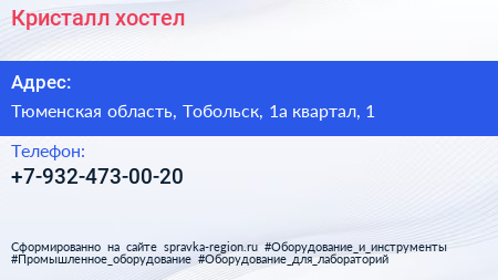 Кристалл, хостел по адресу Тюменская область, Тобольск, 1а квартал, 1 в дальнейшем Организация, размещена в следующих категориях:
