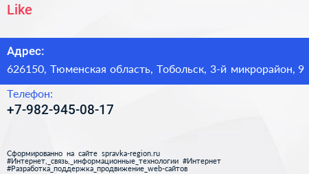 Like по адресу 626150, Тюменская область, Тобольск, 3-й микрорайон, 9 в дальнейшем Организация, размещена в следующих категориях: