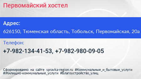 Первомайский, хостел по адресу 626150, Тюменская область, Тобольск, Первомайская, 20а в дальнейшем Организация, размещена в следующих категориях: