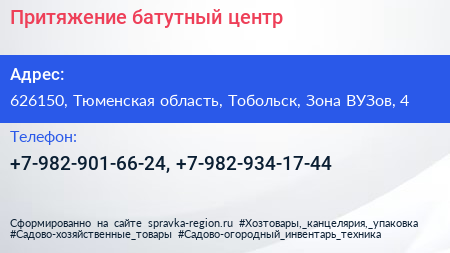 Притяжение, батутный центр по адресу 626150, Тюменская область, Тобольск, Зона ВУЗов, 4 в дальнейшем Организация, размещена в следующих категориях:
