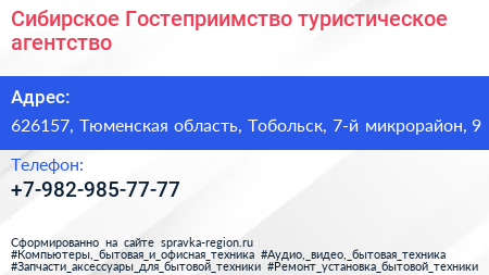 Сибирское Гостеприимство, туристическое агентство по адресу 626157, Тюменская область, Тобольск, 7-й микрорайон, 9 в дальнейшем Организация, размещена в следующих категориях: