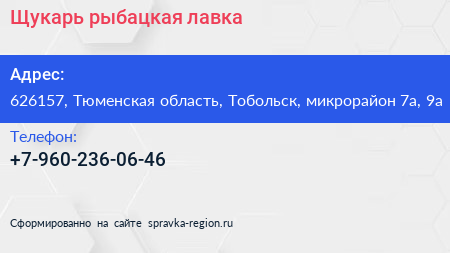 Щукарь, рыбацкая лавка по адресу 626157, Тюменская область, Тобольск, микрорайон 7а, 9а в дальнейшем Организация, размещена в следующих категориях: