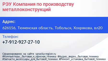 РЭУ, Компания по производству металлоконструкций по адресу 626156, Тюменская область, Тобольск, Хохрякова, вл20 в дальнейшем Организация, размещена в следующих категориях: