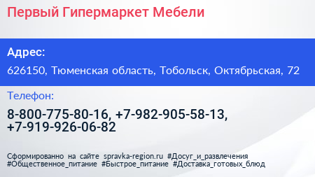 Первый Гипермаркет Мебели по адресу 626150, Тюменская область, Тобольск, Октябрьская, 72 в дальнейшем Организация, размещена в следующих категориях:
