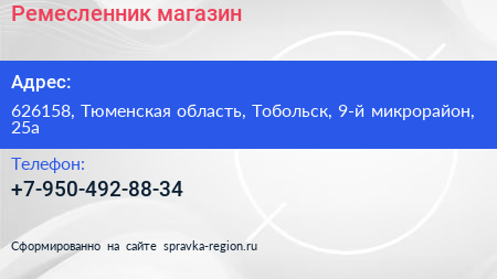 Ремесленник, магазин по адресу 626158, Тюменская область, Тобольск, 9-й микрорайон, 25а в дальнейшем Организация, размещена в следующих категориях: