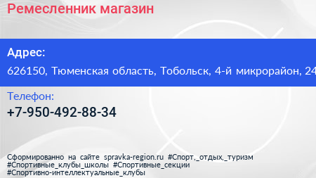 Ремесленник, магазин по адресу 626150, Тюменская область, Тобольск, 4-й микрорайон, 24 в дальнейшем Организация, размещена в следующих категориях: