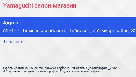 Yamaguchi, салон-магазин по адресу 626157, Тюменская область, Тобольск, 7-й микрорайон, 30 в дальнейшем Организация, размещена в следующих категориях: