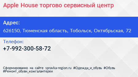 Apple House, торгово-сервисный центр по адресу 626150, Тюменская область, Тобольск, Октябрьская, 72 в дальнейшем Организация, размещена в следующих категориях: