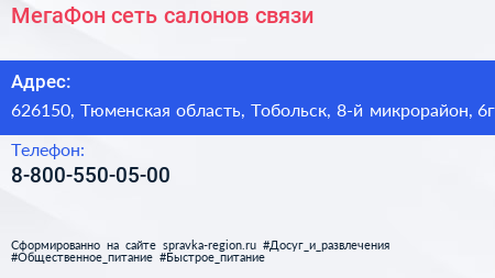 МегаФон, сеть салонов связи по адресу 626150, Тюменская область, Тобольск, 8-й микрорайон, 6г в дальнейшем Организация, размещена в следующих категориях: