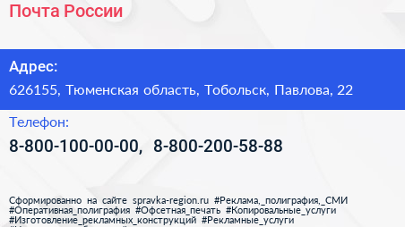 Почта России по адресу 626155, Тюменская область, Тобольск, Павлова, 22 в дальнейшем Организация, размещена в следующих категориях:
