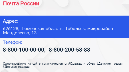 Почта России по адресу 626128, Тюменская область, Тобольск, микрорайон Менделеево, 13 в дальнейшем Организация, размещена в следующих категориях: