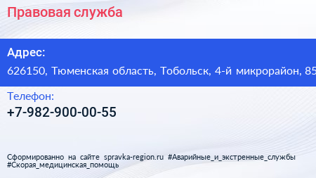 Правовая служба по адресу 626150, Тюменская область, Тобольск, 4-й микрорайон, 85 в дальнейшем Организация, размещена в следующих категориях: