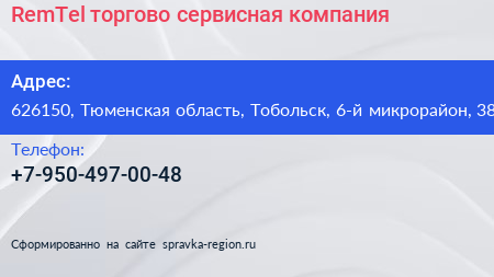 RemTel, торгово-сервисная компания по адресу 626150, Тюменская область, Тобольск, 6-й микрорайон, 38 в дальнейшем Организация, размещена в следующих категориях: