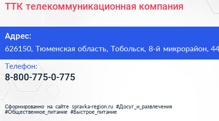 ТТК, телекоммуникационная компания по адресу 626150, Тюменская область, Тобольск, 8-й микрорайон, 44 в дальнейшем Организация, размещена в следующих категориях: