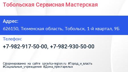 Тобольская Сервисная Мастерская по адресу 626150, Тюменская область, Тобольск, 1-й квартал, 9Б в дальнейшем Организация, размещена в следующих категориях: