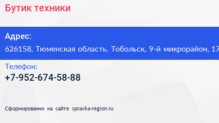 Бутик техники по адресу 626158, Тюменская область, Тобольск, 9-й микрорайон, 17 в дальнейшем Организация, размещена в следующих категориях: