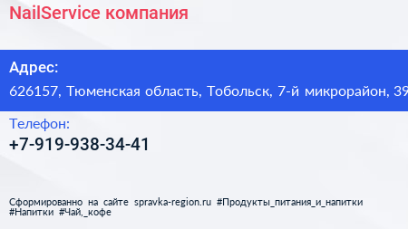NailService, компания по адресу 626157, Тюменская область, Тобольск, 7-й микрорайон, 39 в дальнейшем Организация, размещена в следующих категориях: