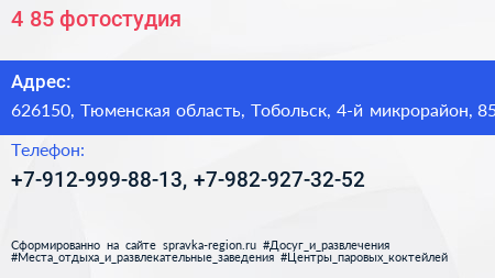 4/85, фотостудия по адресу 626150, Тюменская область, Тобольск, 4-й микрорайон, 85 в дальнейшем Организация, размещена в следующих категориях: