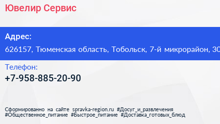 Ювелир Сервис по адресу 626157, Тюменская область, Тобольск, 7-й микрорайон, 30 в дальнейшем Организация, размещена в следующих категориях: